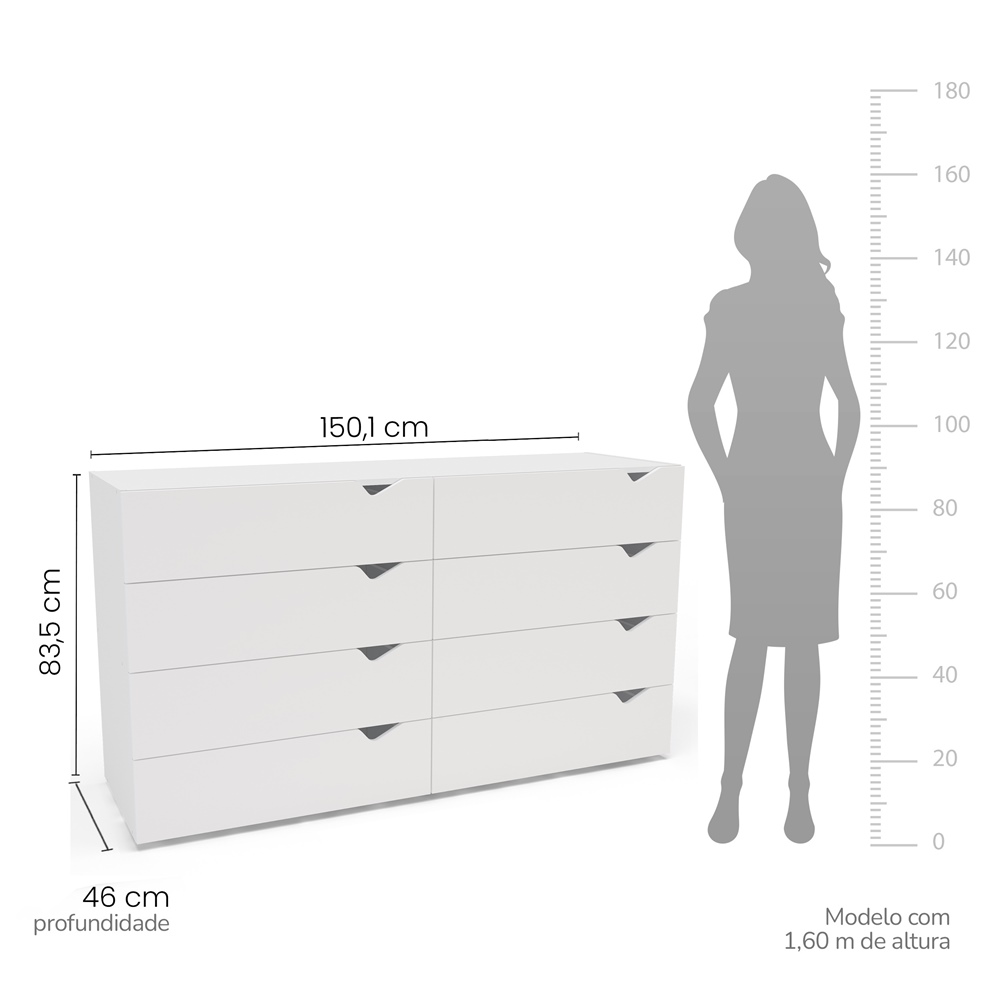 Com 83,5 cm de altura, 150 cm de largura e 46 cm de profundidade, essa cômoda oferece excelente capacidade interna, ideal para organizar roupas, acessórios e objetos de forma prática e funcional.
