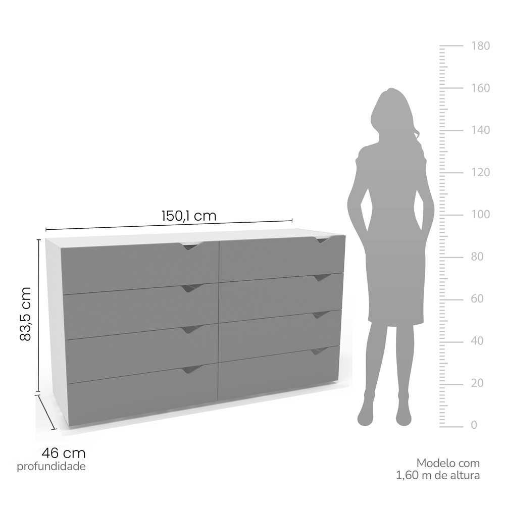 Com 83,5 cm de altura, 150 cm de largura e 46 cm de profundidade, essa cômoda oferece excelente capacidade interna, ideal para organizar roupas, acessórios e objetos de forma prática e funcional.