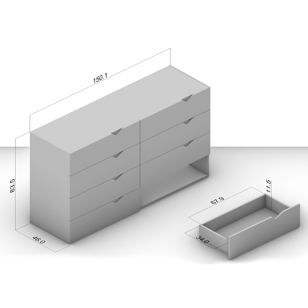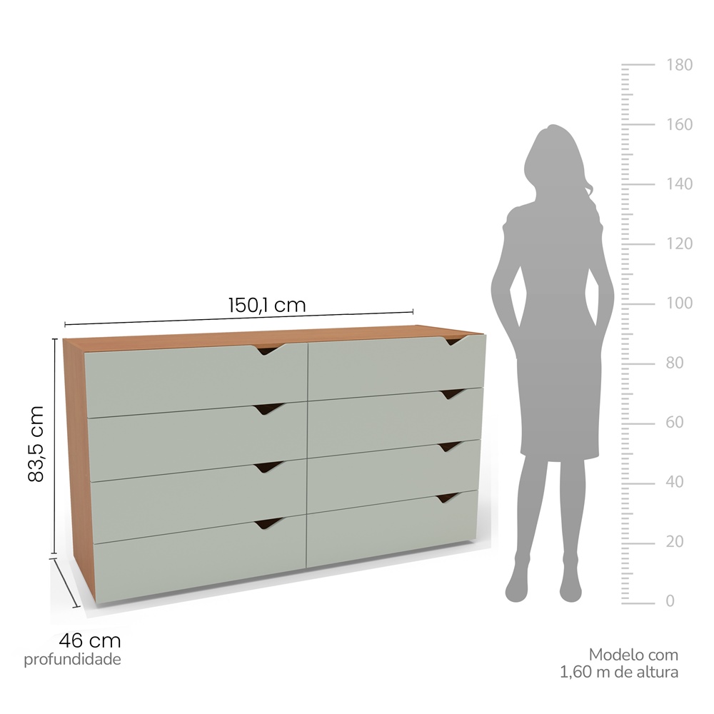 Com 83,5 cm de altura, 150 cm de largura e 46 cm de profundidade, essa cômoda oferece excelente capacidade interna, ideal para organizar roupas, acessórios e objetos de forma prática e funcional.