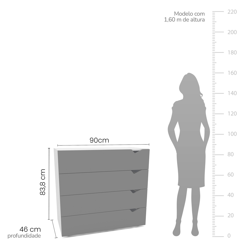 Com 83,8 cm de altura, 90 cm de largura e 46 cm de profundidade, essa cômoda oferece excelente espaço interno para roupas, acessórios e objetos pessoais — sendo uma ótima opção para quartos, closets e ambientes multifuncionais.