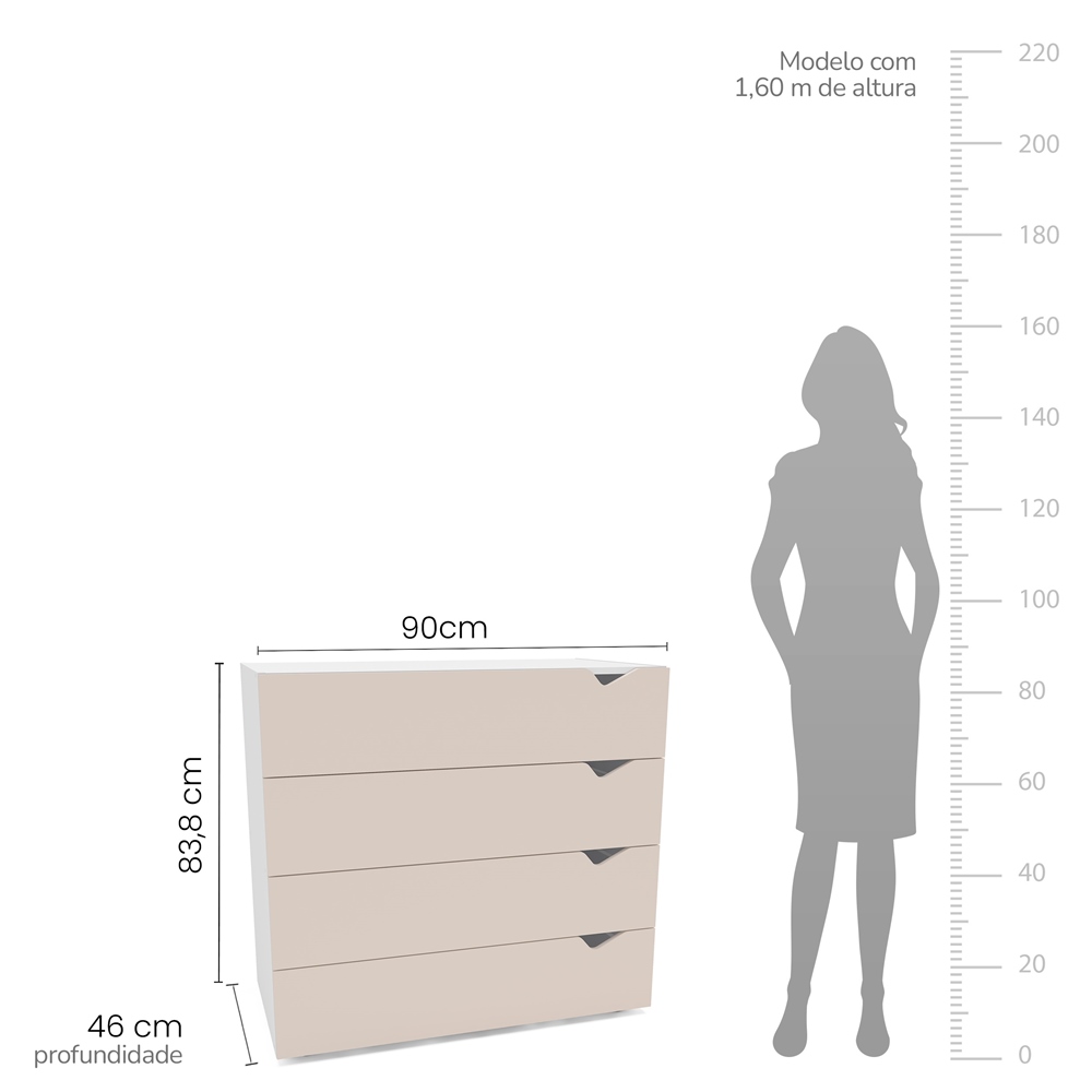 Com 83,8 cm de altura, 90 cm de largura e 46 cm de profundidade, essa cômoda oferece excelente espaço interno para roupas, acessórios e objetos pessoais — sendo uma ótima opção para quartos, closets e ambientes multifuncionais.