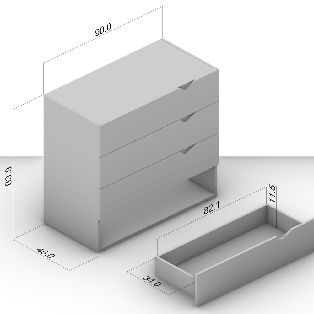 Com 83,8 cm de altura, 90 cm de largura e 46 cm de profundidade, essa cômoda oferece excelente espaço interno para roupas, acessórios e objetos pessoais — sendo uma ótima opção para quartos, closets e ambientes multifuncionais.