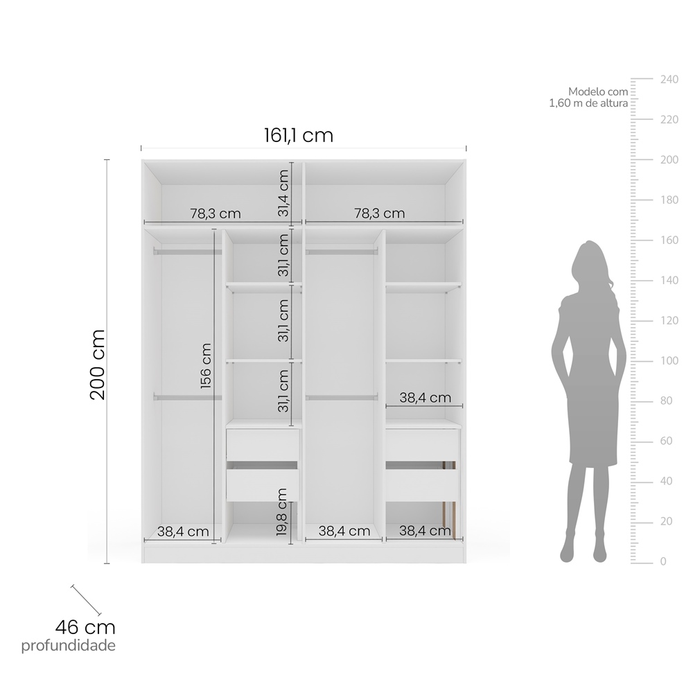 Com 200,4 cm de altura, 161,2 cm de largura e 46 cm de profundidade, o guarda-roupa Lisboa oferece amplo espaço para roupas, calçados e acessórios. Produzido em MDP/MDF com pintura UV, garante durabilidade e resistência. Design atemporal que combina com qualquer decoração. Gavetas com corrediças telescópicas e puxadores externos que facilitam o uso. Ideal para quem busca um móvel funcional e sofisticado.