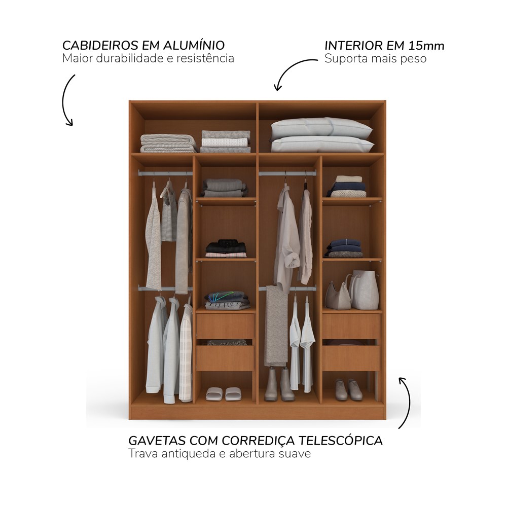 Com 200,4 cm de altura, 161,2 cm de largura e 46 cm de profundidade, o guarda-roupa Lisboa oferece amplo espaço para roupas, calçados e acessórios. Produzido em MDP/MDF com pintura UV, garante durabilidade e resistência. Design atemporal que combina com qualquer decoração. Gavetas com corrediças telescópicas e puxadores externos que facilitam o uso. Ideal para quem busca um móvel funcional e sofisticado.